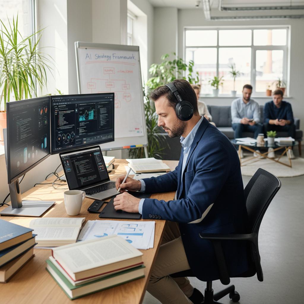 Nowoczesne biuro, gdzie AI staje się integralną częścią codziennej pracy zespołu strategicznego