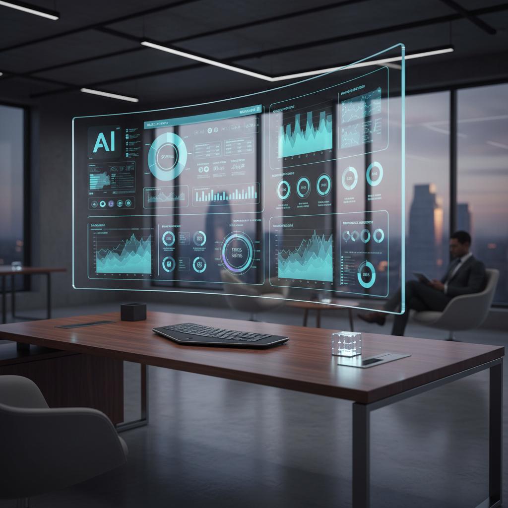 Futurystyczne polskie biuro z nowoczesnymi technologiami doradczymi, zespół współpracuje z AI, trend roku 2025