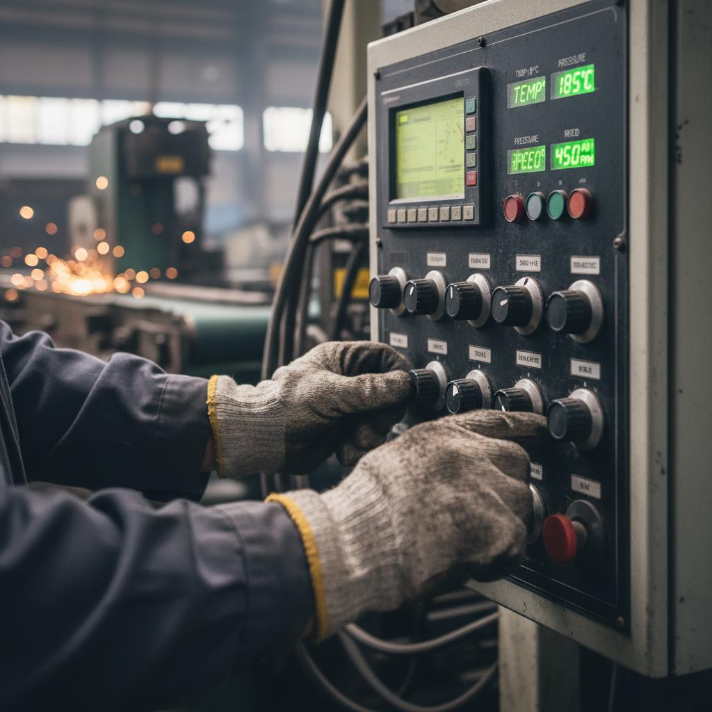 Pracownik ręcznie korygujący ustawienia maszyny – kluczowa rola doświadczenia i wiedzy praktycznej w zarządzaniu produkcją