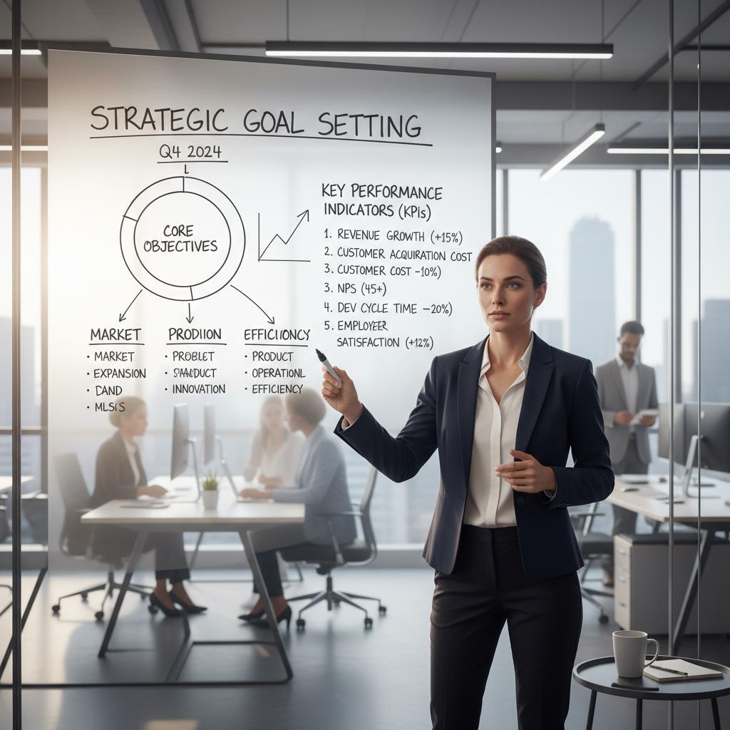 Zdjęcie: lider ustalający konkretne cele na tablicy, wskaźniki KPI w centrum uwagi, zespół zaangażowany w dyskusję.